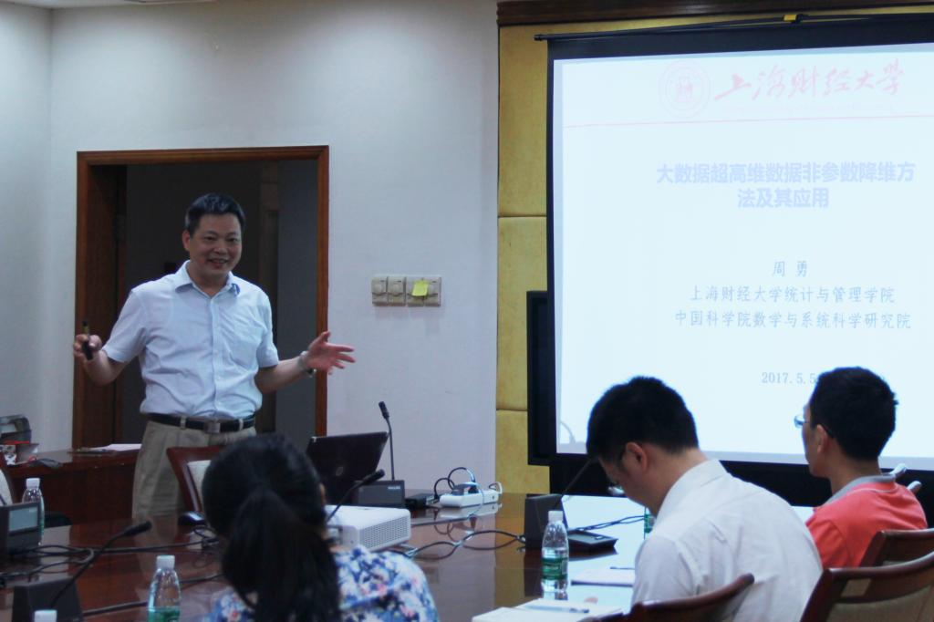 本网讯 5月5日下午,上海财经大学统计与管理学院周勇教授做客广外著名教授论坛第327讲,在我校南校区校办公楼第一会议室分享主题为“大数据超高维数据非参数降维方法及其应用”的研究成果。本次活动由我校人事处、365bet亚洲备用网址主办,我院承办。我院院长易行健教授、副院长展凯教授和姚海祥教授以及教师代表出席讲座。讲座由姚海祥主持。