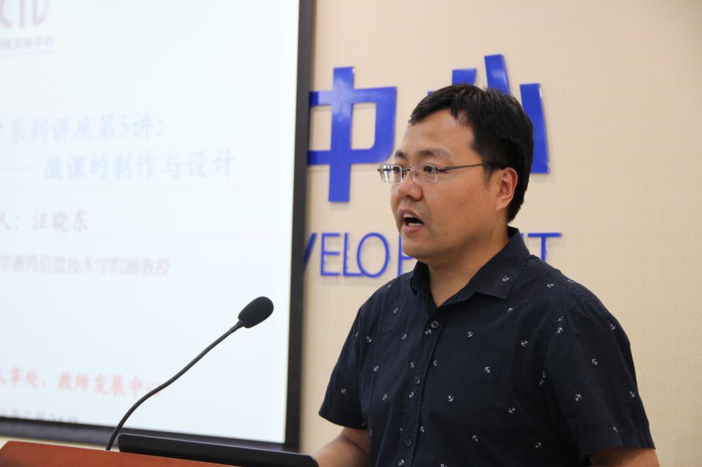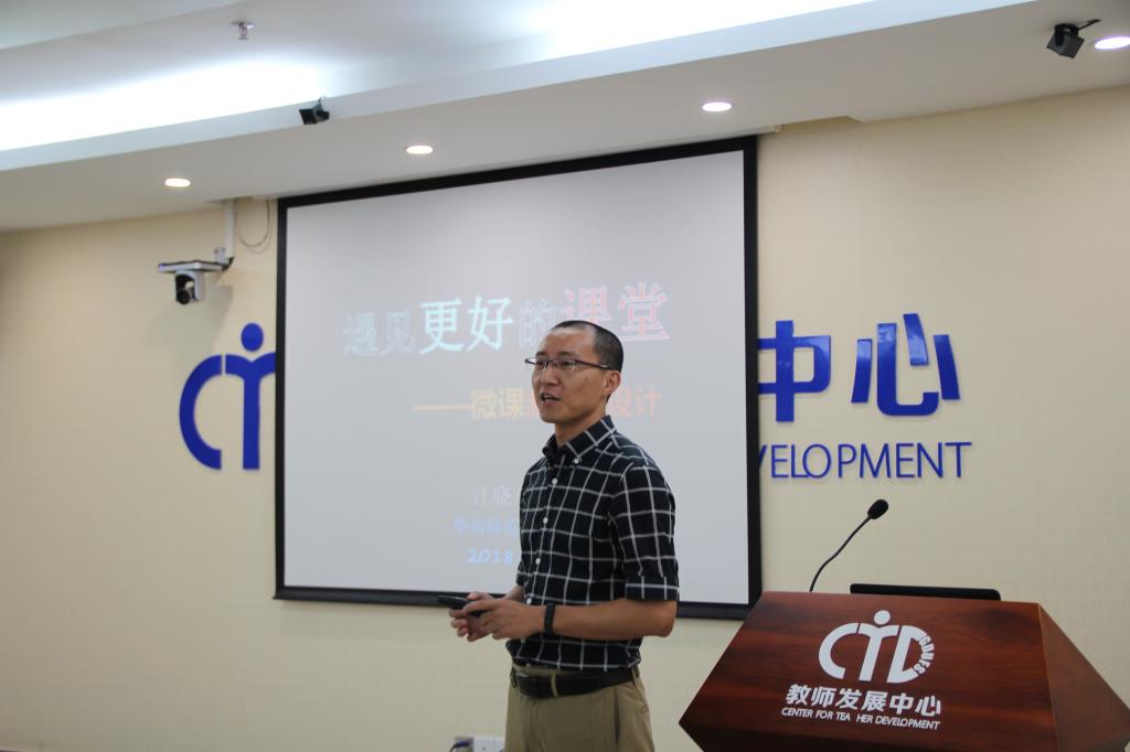 本网讯 为了进一步利用信息化手段提高教学水平,扩大优质教育资源的覆盖融合,实现教育技术与教学资源的深度融合与共享。5月24日下午,365bet亚洲备用网址邀请到了教育部教育管理信息中心特聘专家、华南师范大学教育信息技术学院的汪晓东博士为我校教师开展信息化教学系列培训第5讲,题为“遇见更好的课堂——微课的制作和设计”。365bet亚洲备用网址主任孙远雷、科长陈思、第四届微课比赛参赛教师、学生技术助理及感兴趣的老师来到了现场。培训由孙远雷主持。