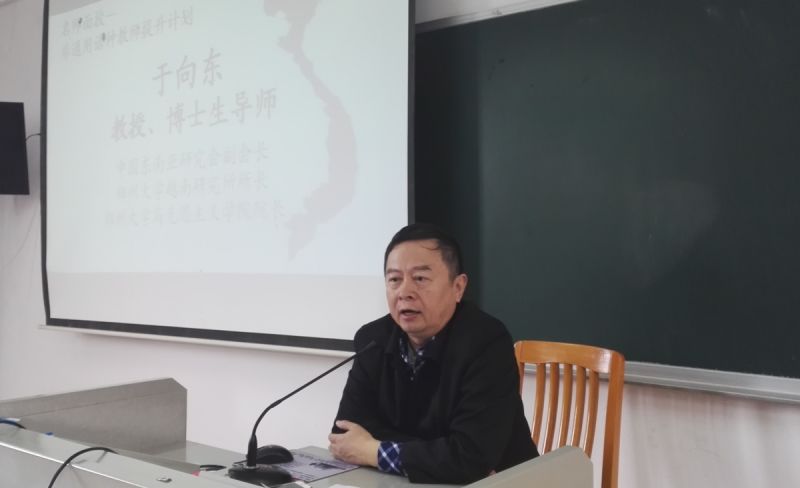 本网讯2016年11月30日上午,广东外语外贸大学“名师面授——非通用语种教师提升计划”迎来国内著名越南问题专家于向东教授。东语学院东南亚研究所刘志强和越南系陈继华、郑虹、蒙霖等老师以及部分研究生、本科生参加了此次活动。