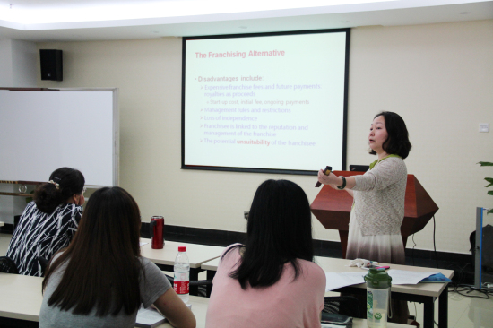首场全英教学示范课由康蕾老师授课,本场示范课的主题为“Entrepreneurship, New Ventures& Business Ownership(创业,新企业与企业所有权)”,以小型企业的诞生与发展作为切入点,围绕主题进行了探讨。其中,3名同学以麦当劳在中国的的扩展为例,对“Franchisee(特许经营人)和Franchisor(授予特许者)”进行了利与弊的分析,现场氛围轻松而活跃。康蕾随后对学生的发言进行了总结,并通过许多中外中小型企业的实例来分析它们的利与弊,也提到了如何开创并经营一个小型企业。