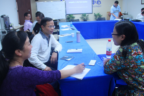 欧阳护华现场让老师们练习了“Empathy”,三位老师一组,互相两两赞美,另外一个人记录,从而了解到了“站在他人角度,互相沟通了解”是深入教学的有效方法。他在沙龙中妙语连珠,引用了各种各样的例子,语言有风趣幽默,常常引得老师们哄堂大笑。
