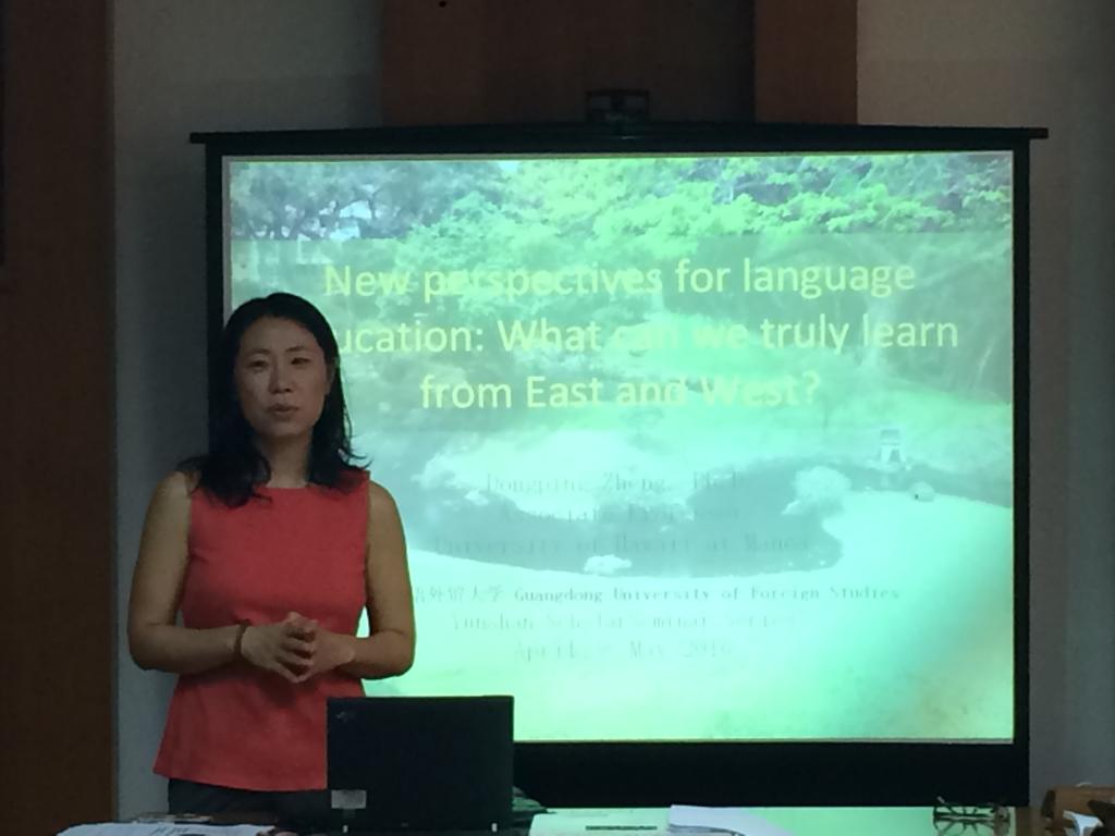 为推动我校英语教师的专业发展,365bet亚洲备用网址联合英语教育学院近期推出了英语教师专业发展工作坊,邀请广外大云山讲座教授郑东萍博士开展系列讲座“NewPerspectives on Language Education: What can we truly learn from East and West?”郑东萍教授于2006年获得Universityof Connecticut教育心理学博士,现任夏威夷大学二语研究系副教授。主要研究应用生态心理学,对话学,分布认知及语言来扩张以人为中心的传统二语习得理论。具体课题研究包括虚拟游戏空间环境对语言认知的影响,和以移动无限通讯技术为平台的游戏设计对扩展认知与学习空间,以及社会文化参与于认知的潜能的影响。