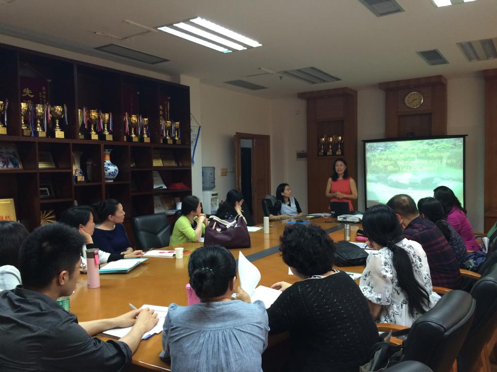 2016年4月21日下午,郑东萍博士系列讲座的首场讲座在院系办公楼245举行,讲座题目为“Ecologicaldialogical perspectives on language education: Examples of abducted learning invirtual worlds”。现场气氛热烈,座无虚席,不少我校老师、学生和其他高校老师慕名前来听讲。她首先以在美国为购买衣柜开展的语言交际活动为例,生动地指出了中西方在哲学、语言、语言学习和教育方面的不同视角,同时肯定了中国儒家、道家思想等传统哲学在语言学习中的价值。在此基础上,郑教授详细讲解了EDD (eco-dialogicaland distributed)Holistic Ontology理论,并提出Eco-dialogical Model (Zheng,2012)。最后,她演示了一段以ELAN软件处理的Eco-dialogical Model教学模式下学生就虚拟世界游戏展开的交流对话录像,并深入浅出地解释了“manipulativeabduction”、“abductedlearning”、“distributed languaging”等概念。在场老师还就自己的研究问题向郑教授汇报请教,老师们对郑教授的精彩讲座充满兴趣,并期待在接下来的系列讲座中继续向郑教授学习。