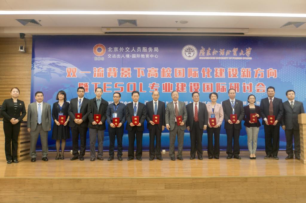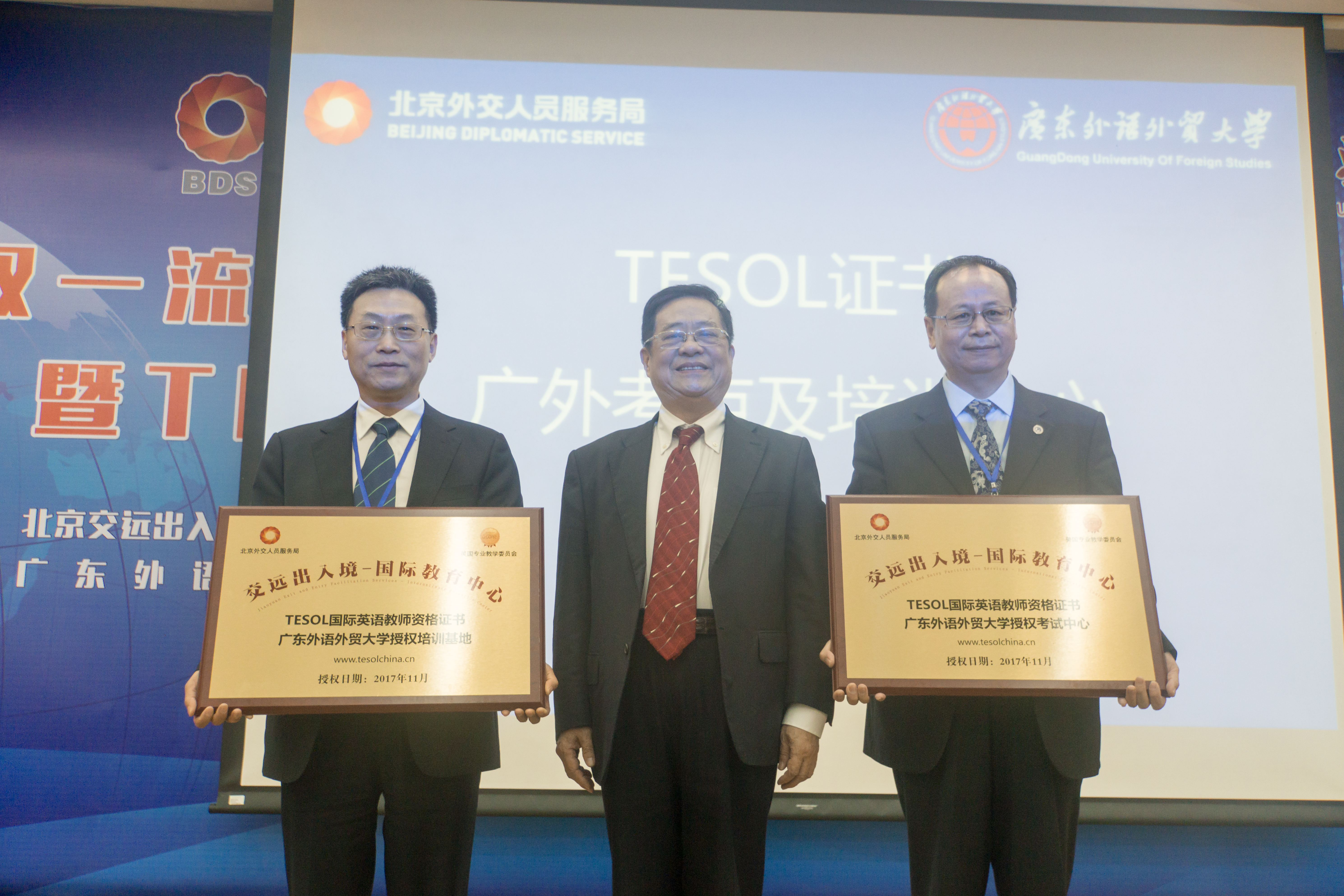 本网讯 11月11日上午,双一流背景下高校国际化建设新方向暨TESOL专业建设国际研讨会在我校北校区图书馆负一层报告厅举行。会上举行“广东外语外贸大学TESOL国际英语教师资格证书考试与培训中心”揭牌仪式,并为TESOL专家委员会13位专家教授颁发聘书。外交部前大使、外交学院前党委书记兼常务副院长袁南生,我校副校长焦方太,北京外交人员服务局北京交远因私出入境公司兼交远国际教育中心主任辛颖和国际教育中心常务副主任杨宏,上海外国语大学教授邹申等出席会议。来自全省教育部门、各高校、重点中学及培训机构共200余名领导与嘉宾参加会议。会议由国际教育中心常务副主任刘志友主持。