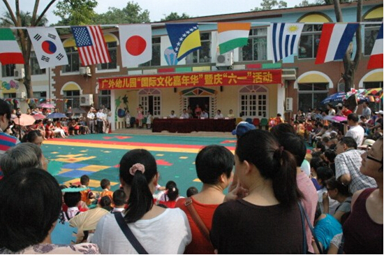 悬挂多国国旗的幼儿园操场增添了节日的气氛